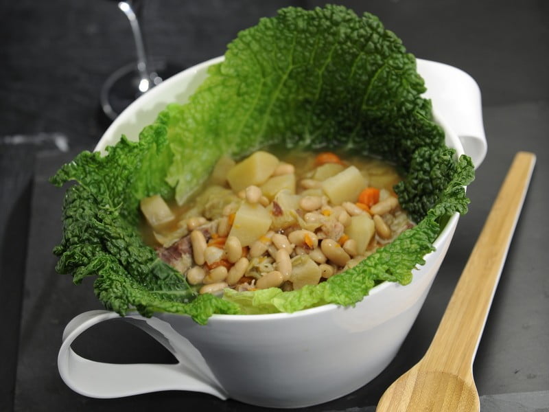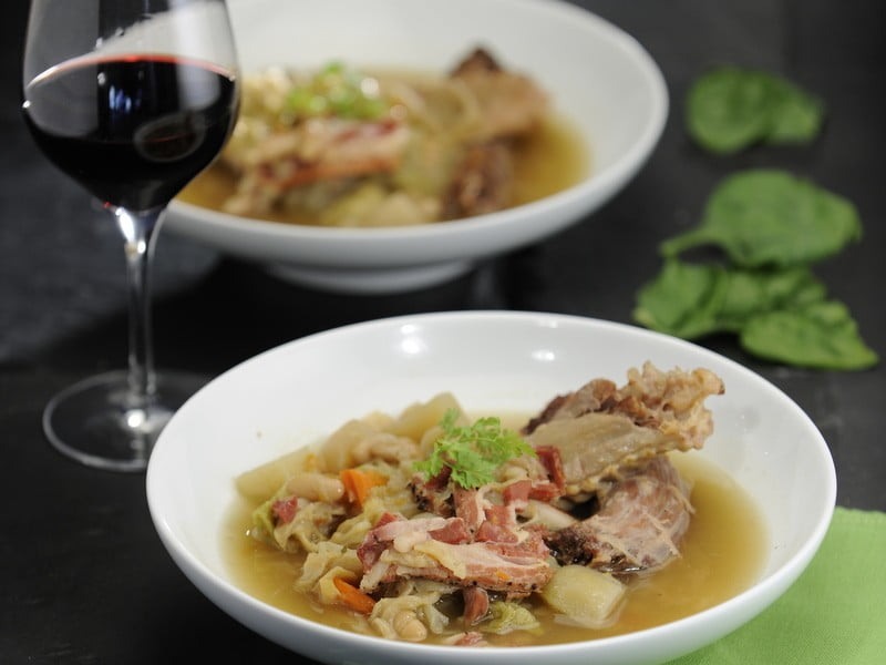 Ingredientes: Manchón de pato (origen Gers - Francia), patatas, col verde, judías lingon, nabos, zanahorias, ventrêche a la parrilla, caldo de cocción (agua, plato de costillas, cuellos y alas de pato, cortezas de cerdo, perejil, zanahorias, apio, ajo, tomillo, laurel, clavo, especias rabelet, sal, pimienta), sal, pimienta.